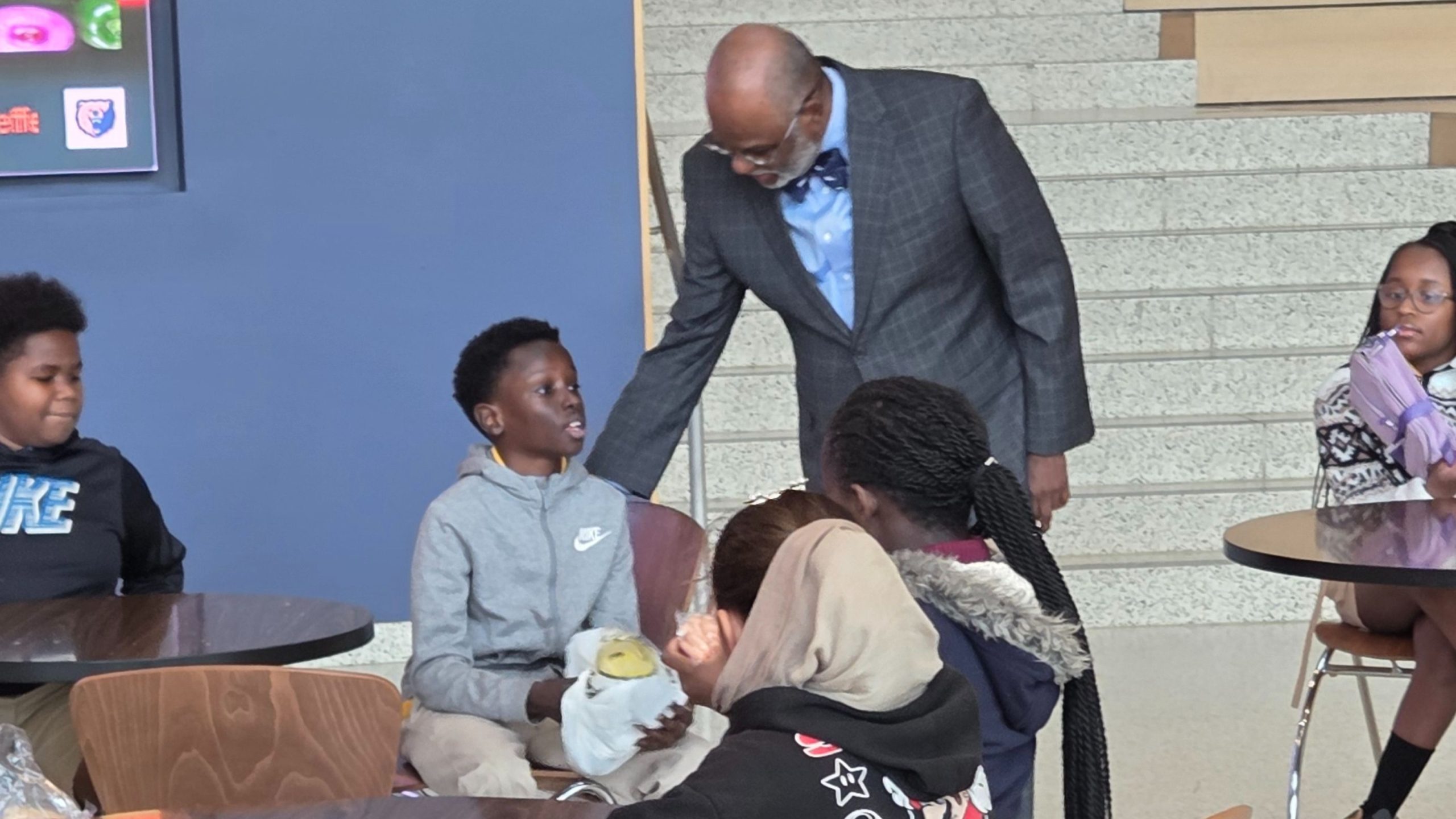During Vanguard Collegiate Middle School’s visit to the Morgan State campus on November 21, Dean Royce Burnett who leads the Earl G. Graves School of Business & Management greeted the students in the Business Center. The students ate their lunch in the Business Center Atrium. This was the Baltimore City school’s second visit to the campus under NCEED’s Young Scholars Campus Visitation Program.
